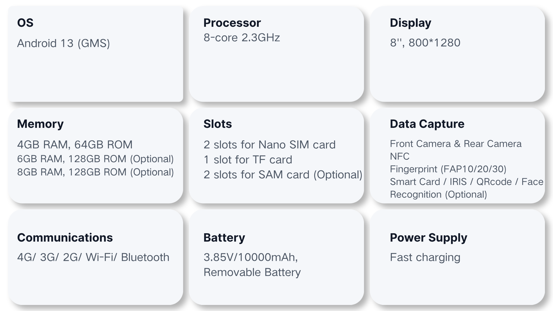 - Multi-Communication & Interface: Support 4G, WiFi, Bluetooth, RJ45, NFC, IC card reader, and multiple interfaces for connecting external devices.